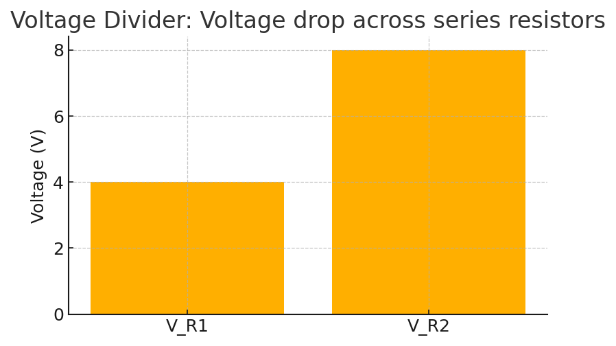 Voltage divider (bộ chia áp) là ứng dụng phổ biến của mạch nối tiếp — dùng để tạo ra điện áp tham chiếu, giảm điện áp cho cảm biến hoặc cho ngõ vào ADC. Công thức cơ bản: